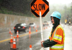 Flagger Rachel Hinkel of Jay stands her post, controlling traffic on a road project on Main Street in Auburn during heavy rain Wednesday. Hinkel said the job was good for now, until she joins the Marine Corps.