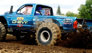 Bob Laweryson of Skowhegan and his “Mud Mutt” kick up some dirt during the Autumn Mud Classic at Barnyard All Terrain in Livermore on Sunday.