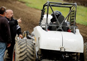 Jody David of Cornish gives Dean Tardiff of Shapleigh the thumbs up as Tardiff gets ready to race David’s mud dragster “Bad Company” during the Autumn Mud Classic at Barnyard All Terrain in Livermore on Sunday.