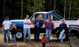 Joe Arsenault, left, of Rumford, his 5-year-old daughter Destiny Jackson, Dean Porter of Augusta, Ken Arsenault of Rumford, Heidi Adams of East Dixfield, Samantha Mayberry of Andover and her 3-year-old son Daniel Batty, foreground, relax in the pit area during the Autumn Mud Classic at Barnyard All Terrain in Livermore on Sunday.