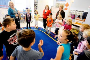 Kindergarten teacher Barbara Boulet, top left, leads her class as they march to “You’re a Grand Old Flag” during morning warm-ups at Park Avenue Elementary School in Auburn on Friday. Edy Churchill, an education technician at back center, and Principal Vickie Gaylord, back right, sing and dance along with the students. Parents and members of the Park Avenue community are welcome to sing along with students and staff every other Wednesday during “Morning Sing.” The community-building event begins at 8:40 a.m.