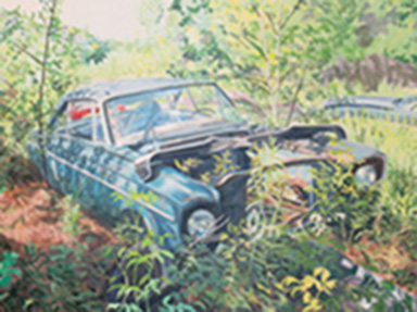 The exhibit features vignettes of decaying cars reclaimed by raspberry vines, a menagerie of taxidermy lovingly arranged and the sense of a humble place in the natural world. The re-purposed, discarded and venerated objects within these paintings may be understood as portraits.
