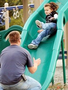 Lilly Pelletier, 3, slides into the waiting arms of her father, Blaine, as they play in the park on the town green in Turner on Thursday. “Her energy could wear me out,” Blaine said.