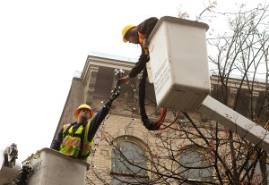 Norm Saindon, left, and Nick Poland of the Lewiston Public Works Department string Christmas lights on trees downtown on Lisbon Street on Tuesday. A crew member said fewer trees will have lights this Christmas season to save money.