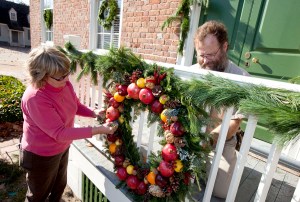 Curry, foreman at the landscape nursery, creates many of the 18th century-style fruit wreaths, putting together 25 for different doorways. Since early Thanksgiving week, the designers and crews of carpenters have been putting everything up so the Governor’s Palace, trade shops and private homes look seasonally sensational.