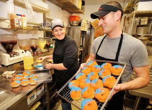 Carol Robitaille, left, and her son Shawn Robitaille, owners of the Tim Hortons restaurant in Lewiston, make Maineiacs doughnuts Friday using sprinkles with the team’s colors, orange and blue. Tim Hortons stores in Lewiston-Auburn were to give away 1,500 Maineiacs doughnuts during Friday night’s game at the Androscoggin Bank Colisee. The Auburn Tim Hortons stores are owned by Karl and Jillian Carter.