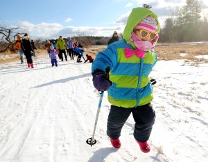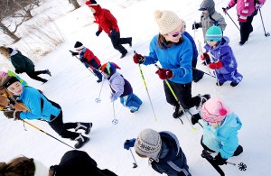 Audrey Bennett, left, and her sister Lauren lead a group of children during the first day of the YMCA Cross Country Ski Program in Auburn on Sunday. Audrey, a junior at Edward Little High School, and Lauren, a senior, both members of the ELHS Nordic ski team, are coaching children on the principals of Nordic skiing during the nine-week program on the Auburn Nordic Ski Association Trails off Perkins Ridge Road. Twenty children from age 3 to eighth grade practiced using their poles on Sunday. “This is the future, and it’s great to see,” ELHS ski coach Dan Campbell said.