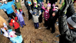 Edward Little High School Nordic ski coach Dan Campbell, right, leads the children in a snow dance following the first day of the YMCA Cross Country Ski Program in Auburn on Sunday. Campbell said he is confident the dance will bring lots of snow for the second class next Sunday.