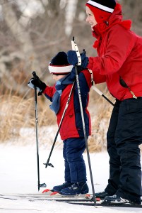 Marnie Dubois of Auburn and her 4-year-old son Ben ski together during the YMCA Cross Country Ski Program in Auburn on Sunday.