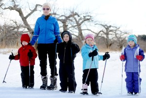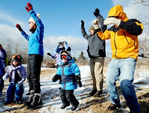 Nora Condit of Auburn, Lauren Bennett of Auburn, Diana Sullivan of Minot, Landon Jackson of Lewiston, Joe Hall of Auburn and Kyle Jackson of Lewiston perform a snow dance during the first day of the YMCA Cross Country Ski Program in Auburn on Sunday. Program director Dan Campbell said he is confident the dance will bring lots of snow for the second class next Sunday.