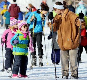 Jan Boyce of Turner helps Alison Eller, 4, of Auburn with pole technique during the first day of the YMCA Cross Country Ski Program in Auburn on Sunday. Boyce is the Edward Little High School Nordic ski team manager.