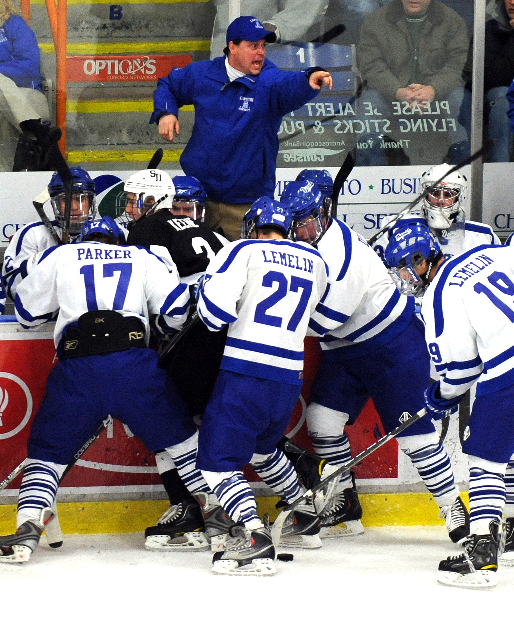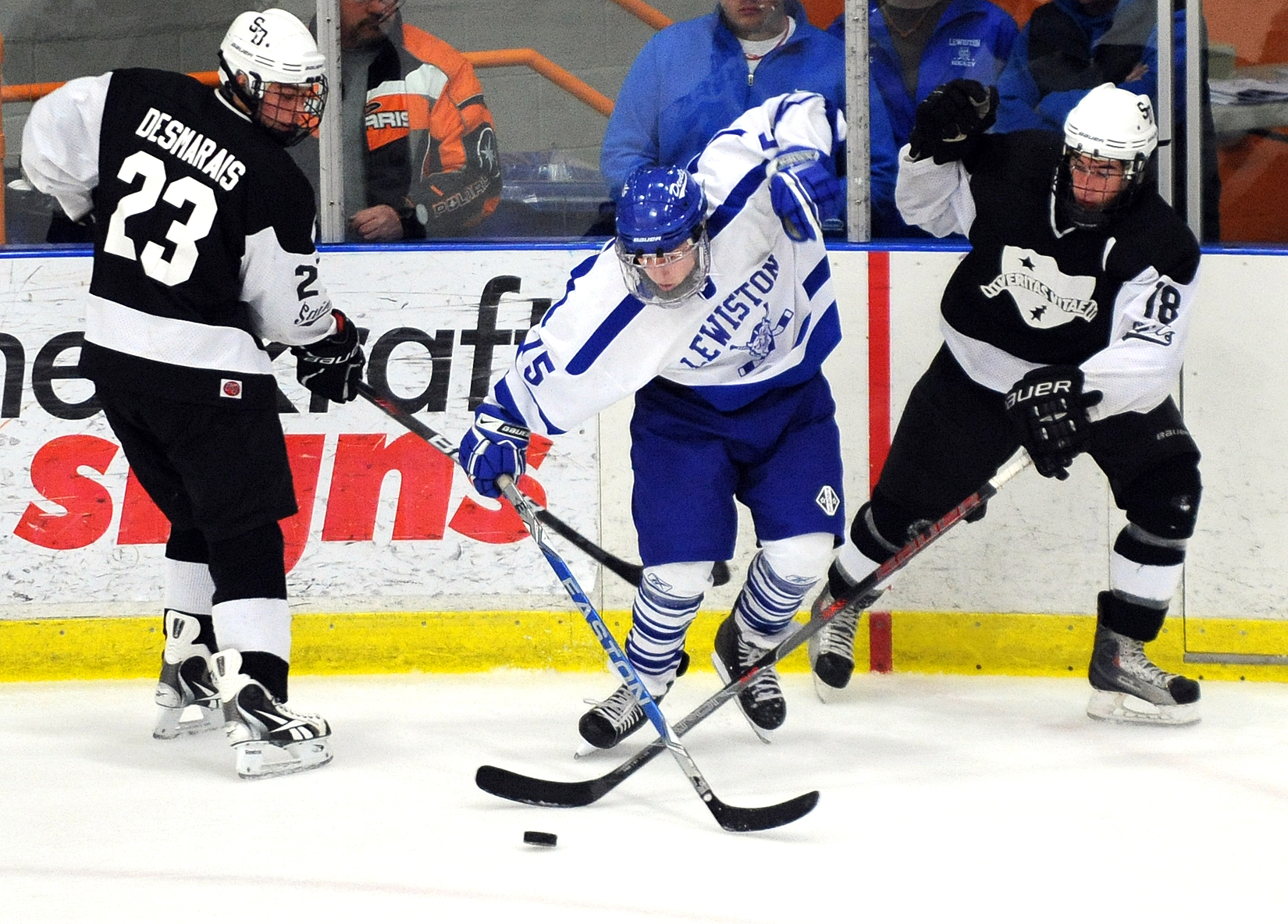 After Steele’s second made it 3-0 Lewiston, Alex Parker capped a flurry of activity near Poussard’s crease with a goal to pull the Saints within two at 3-1. With the goalie pulled, St. Dom’s continued to fire shots toward the net. many were blocked in front, and Poussard held his ground on the few that got through until Beland ended it from the red line at 14:45 of the final frame.