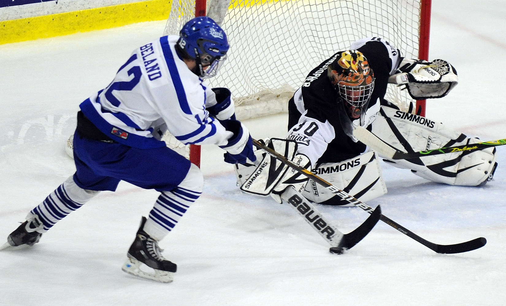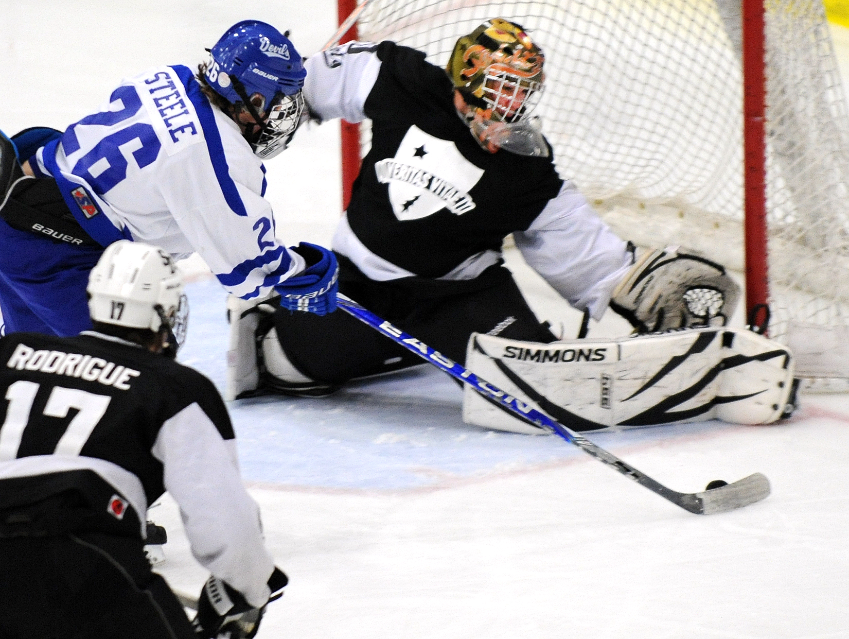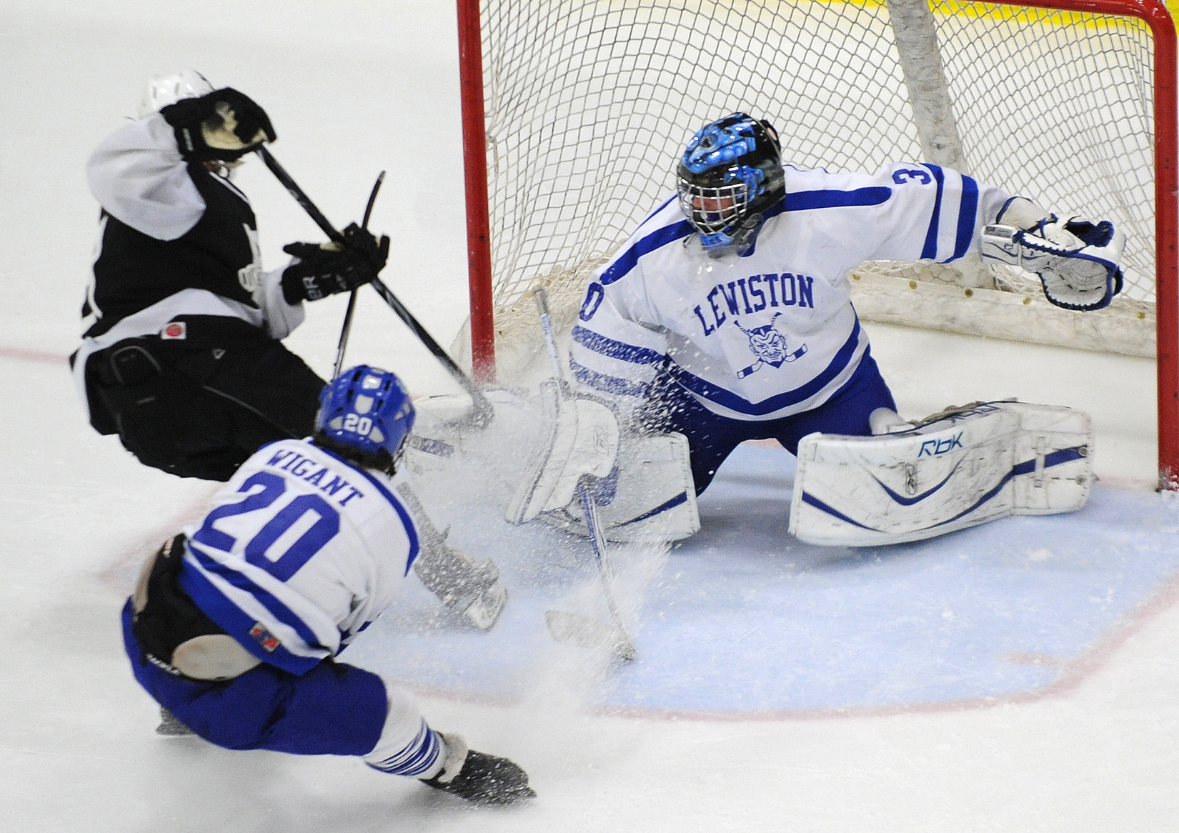 Kyle Lemelin nearly put his team up by three, but hit the post on a partial breakaway with less than two minutes to play in the second, and Christopher made another huge save, this one with his right pad as he pushed right to left against a Lewiston 3-on-1, to send the teams into the break with the Blue Devils on top, 2-0.