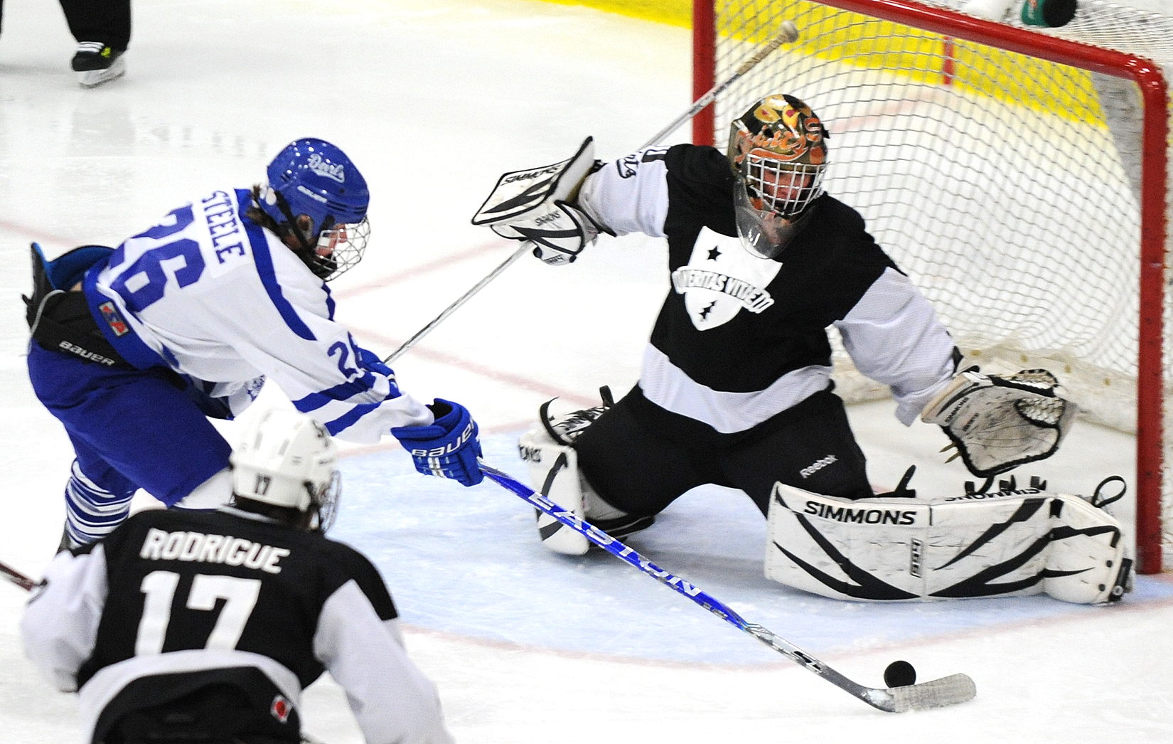 Both goalies got into the act later in the second. Christopher robbed Desmond Gagne with a flash of the leather just shy of the nine-minute mark, and Poussard matched him a minute later when he snagged an Alex Parker offering labeled for the top right corner of the cage.
