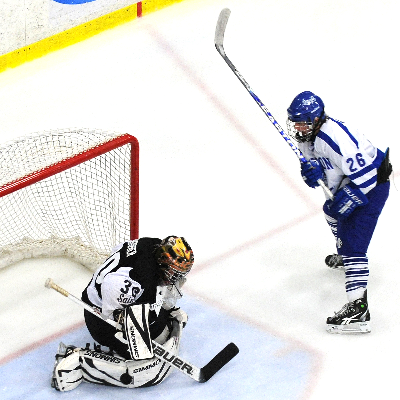 Ben Wigant slipped behind the Saints’ defense after both blueliners pinched toward Sam Cloutier on a 2-on-2 rush. Cloutier flipped the puck to Wigant, who kept the puck on his backhand, leaned in on the recovering defenseman and flipped it through Christopher to put the Blue Devils on top, 1-0.