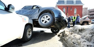 Aaron Martel, left, looks at damage to a vehicle that hit the truck he was driving at the corner of Court Street and Mechanics Way in Auburn on Wednesday morning. While stopped at the light, he watched an SUV driven by Emily Vintinner of Auburn fly through the air and land on the hood of his truck after hitting a pickup that was also going through the intersection.