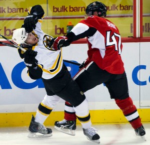 The Bruins also traded with Atlanta on Friday, acquiring center Rich Peverley and defenseman Boris Valabik in return for right wing Blake Wheeler and defenseman Mark Stuart. Peverly will join the team Sunday in Boston while Valabik will report to Providence of the AHL. Marchand scored 6:47 into the second to tie it at 1, using Ottawa defenseman Andre Benoit as a screen to fire a wrist shot past Lehner into the top of the net. Horton scored his 15th goal 9:47 into the third to make it 2-1. Seidenberg increased the lead to 3-1 with a power-play goal at 15:20. Anderson arrived at Scotiabank Place after the game was underway. He got dressed after traveling from Denver and took Pascal Leclaire’s place as the Senators’ backup.