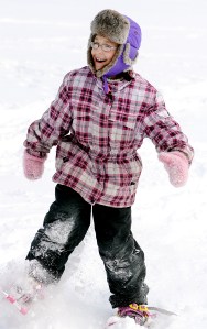 Zoey Capponi, 8, of Greene snowshoes on Hooper Pond during the Day of Play in Greene on Sunday. The Greene Dragons Snowmobile Club hosted the event to encourage kids and their families to get outside during the winter. “We would like the kids to know that there is more about winter than sitting in front of a video game,” club treasurer Tony Bussiere said. The event featured games, snowshoe races, an ice fishing derby, a cookout and prizes for every child, club member Angie Danforth said. The club has about 40 members and maintains 32 miles of snowmobile trails.