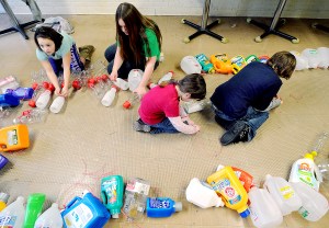 Lily Hoffman, left, of New Gloucester, Jasmine Griffin of New Gloucester, Sophia Hartley of Auburn and Nick Hartley of Auburn make a giant bug from recycled bottles at the Lewiston Armory on Wednesday. Fifteen children from the Nature Kids on Outdoor Adventures 4-H Club are making the bug for Earth Day, April 22. Nature Kids focuses on hiking, gardening, trail maintenance and nature studies. The club is seeking empty detergent bottles and fence wire to finish its project. Supplies can be dropped off at the University of Maine Cooperative Extension Office at 24 Main St. in Lisbon Falls or at the Lewiston Armory on Wednesdays from 1 to 3 p.m.