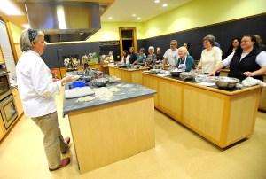 Once the small balls of dough were set aside for 30 minutes, the room quieted down and Reimers gave a lesson on the sourdough starter. She has kept her starter alive for 21 years, and shares it willingly in her classes. A little gooey and slightly stretchy, the raw starter contains small fermentation bubbles that ultimately make the bread rise. This eliminates the need to add commercial yeast to your bread, and makes it much more flavorful.