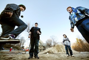 Jacob Gottlieb, 15, from left to right, plays hacky sack with Jacob Carpenter, 17, Kane Gottlieb, 8, and Nathan Vining, 16, off Gamage Avenue in Auburn on Wednesday evening.