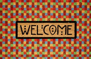 A pretty welcome mat decorated with small, colorful squares and “Welcome” in a fun, comic-like font in the center. Looks like it could gladly scrape the dirt from your soles and warmly welcome guests. It’s hard to find both in a mat.