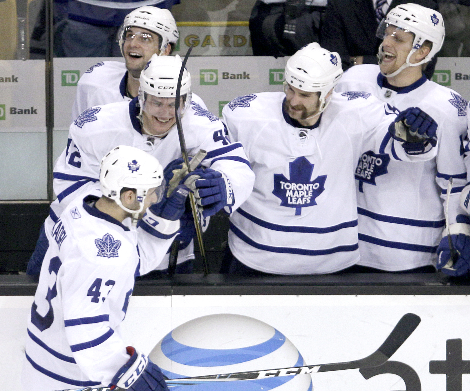 But Toronto tied it at 2 on Lupul’s power-play goal at 7:06 before the Bruins took the lead on Ference’s goal 1:25 later. Ference charged from the point to a loose puck along the boards and fired a shot that deflected off a Maple Leafs player and between Reimer’s pads.