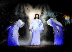 In the resurrection scene, Enya-like music played. Two high-intensity black lights lit up angels who walked down the aisle and surrounded the tomb. Light, and smoke from dry ice, came from within the tomb. The stone moved. In a white robe, Jesus stepped out.