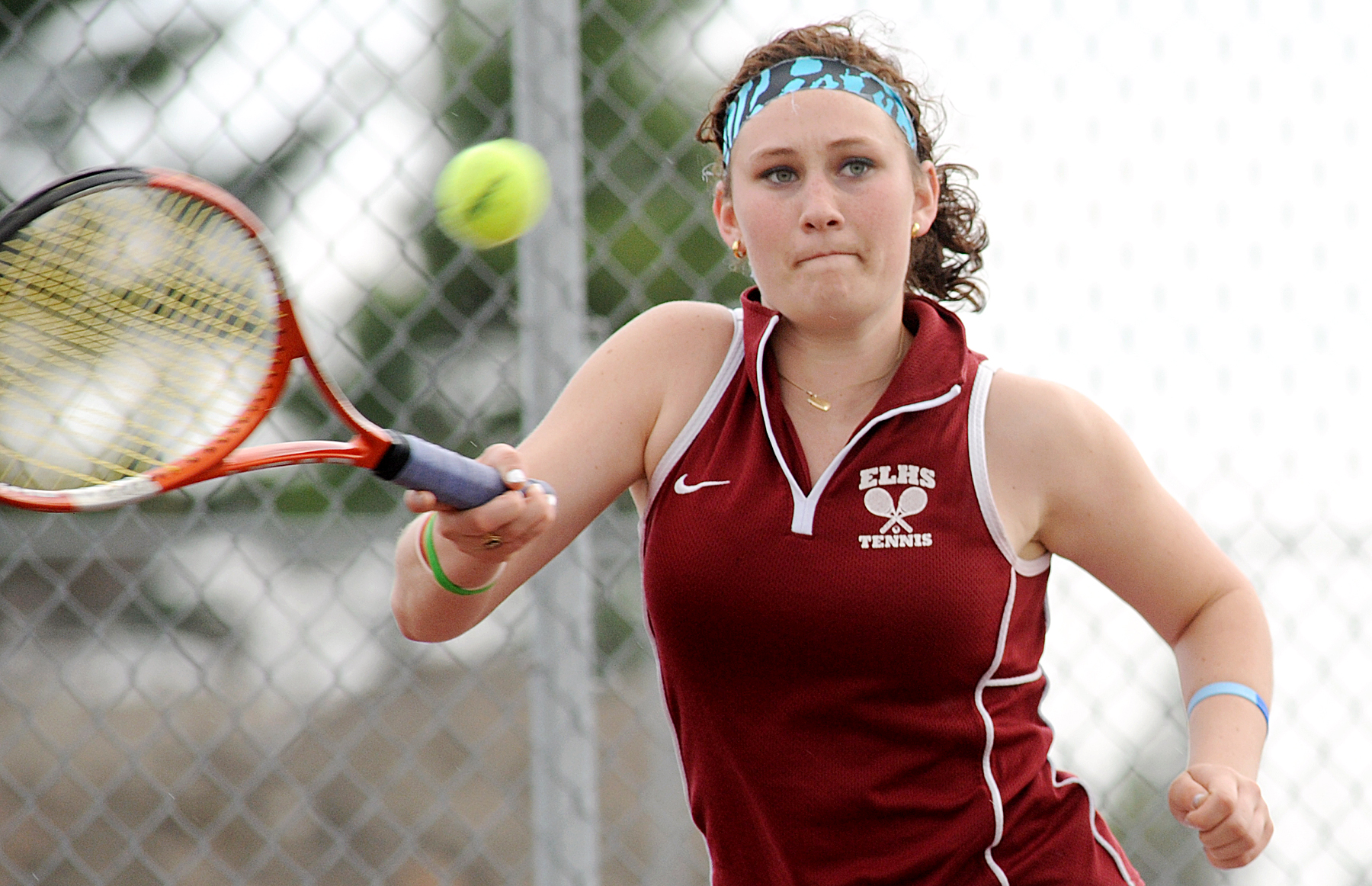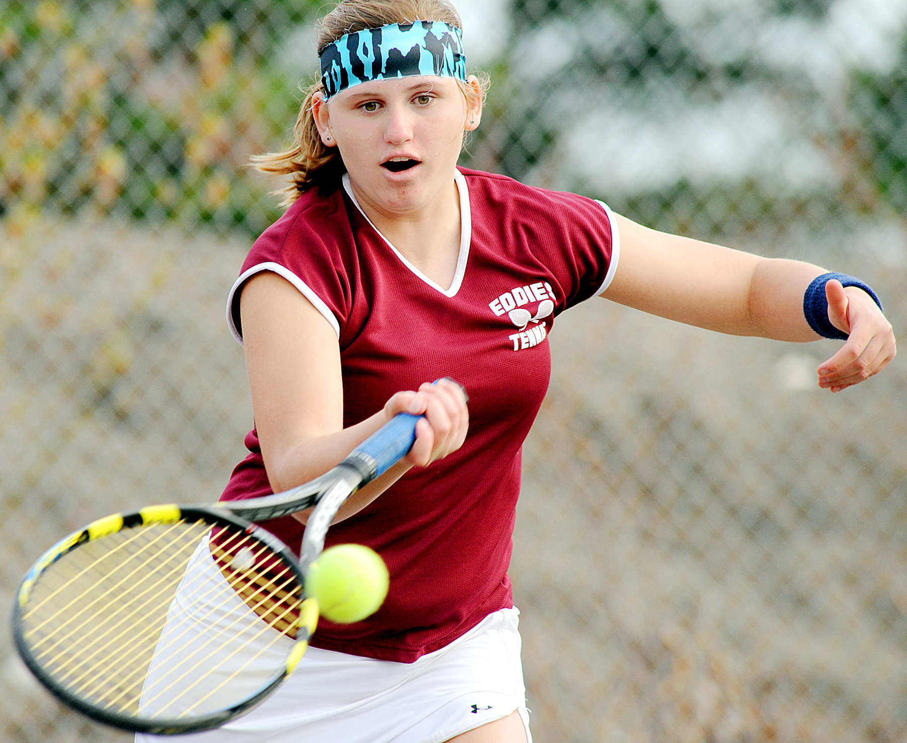 Victoria Bunker returns a shot for Edward Little High School during the number one doubles matchup against Mt. Ararat in Auburn on Friday. Bunker’s double’s partner is Megan Howes.