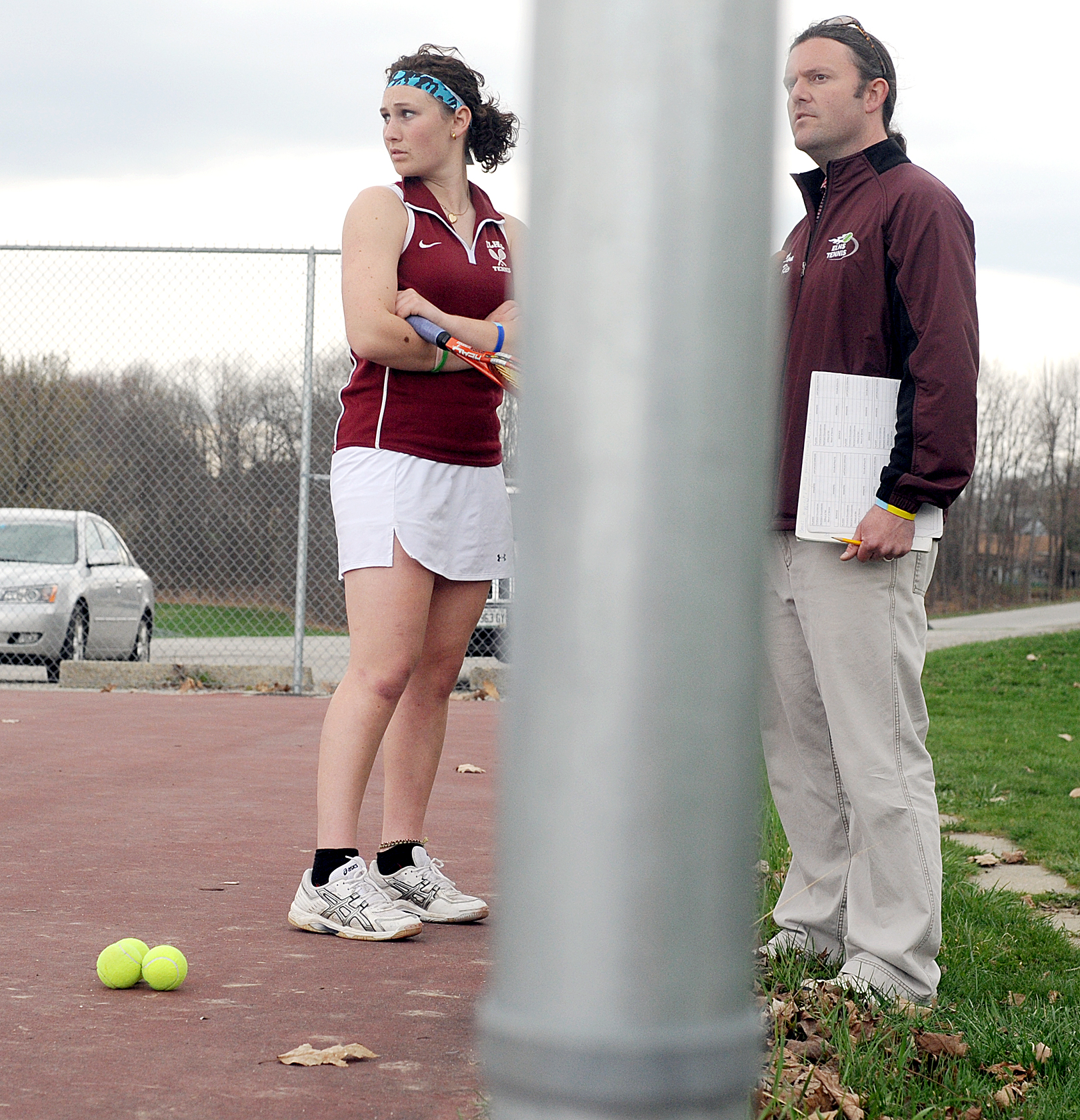Head coach Shawn Rice talks with number two singles player Ashley DeBlois during Friday’s match against Mt. Ararat in Auburn.