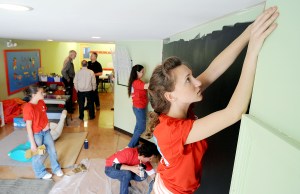 Robin Gallop of North Monmouth helps cover a wall with chalkboard paint at The Root Cellar in Lewiston on Thursday. Gallop, her sister Meagan, left, mother Heidi, bottom, and Laurie Danforth were among 30 volunteers who did odd jobs at the inner-city ministry during the third annual Keller Williams Realty “Red Day.” Keller Williams employees and their children painted, did yardwork and cooked hamburgers and hot dogs for 300 community members, said Realtor Steve Morgan of Lewiston. Root Cellar Director Chris Pope said, “We are very honored that they picked us to be a part of their day. It’s just amazing.”