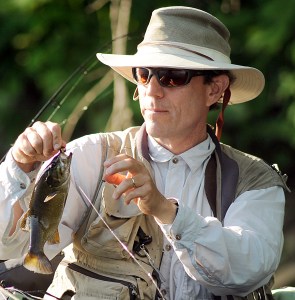 “Who wants a photo op?” he hollered after 10 minutes in the water. A smallmouth bass dangled from his line.