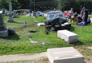The Kia struck and threw several headstones, and then slammed into the Woodsum monument, a 500- to 600-pound Canadian pink-granite memorial stone mounted atop a stone pedestal.