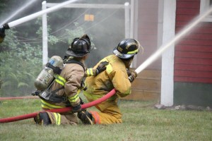Firefighters from different towns work together in Mt. Vernon Tuesday.