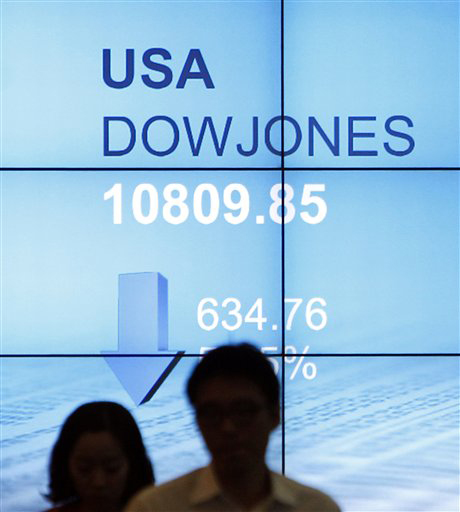 The Dow was down 5.5 percent at 10,809.85. The sharp drop extended Wall Street’s almost uninterrupted decline since late July, when the Dow was flirting with 13,000. It fell below 11,000 for the first time since November.