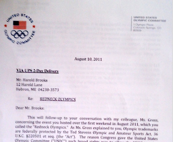 Citing the Ted Stevens Olympic and Amateur Sports Act, the letter said there is “no question” that Brooks violated federal law by selling tickets to the Redneck Olympics, which cost $15 to $20 for the weekend, including camping. The act gives the USOC all rights to the word “Olympics” in the United States.