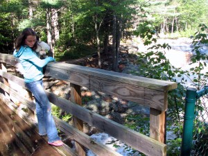 Marie Ring of Topsham, who was at her Greenwood camp during Tropical Storm Irene on Sunday, decided to get a close view of the raging water at Snow Falls in West Paris with her dog Minnie. The several inches of water on the foot bridge made her climb on the side rungs to cross over as Minnie looks down.