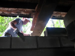Bricks will eventually be placed over the cement blocks to restore the original look of the foundation.