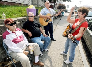 Theresa Cyr of South Portland and Charlie Ames of Rumford play guitars while Vincent Cote, left, of Brewer and Arthur Keniston of Bangor sing the French Canadian song “Alouette” during the 100 Pine Street Wellness and Recovery Center’s fourth annual block party in downtown Lewiston on Saturday. The event raised money for the nonprofit agency that works with adults with mental health disabilities. The day center is a place where people with mental illnesses can do their laundry, play pool, have a bite to eat, take showers or read in the quiet room, said Bobbie-Jean Banton, acting program manager.