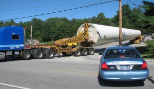 Once the wind turbine parts are loaded onto trucks, Maine State Police escort the trucks. At times roads have to be shut down for short periods. For example, as a truck with a tower was making the turn from Route 219 to Route 26 in West Paris, traffic was stopped for about five minutes.