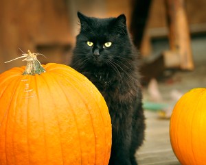 Ovelina, a cat owned by Renee Cyr of Auburn, looks out from her porch over some pumpkins on a rainy Thursday afternoon.