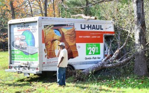 Jerome Smith Sr. of Lewiston waits for a tow truck to pull the moving van containing his belongings after it veered off Pinewoods Road in Lewiston on Tuesday. Smith’s friend, Carey Mathis of Lewiston, said he was driving the moving truck past Apple Valley Golf Course when he had to swerve to avoid another vehicle coming at him in the wrong lane. Mathis drove onto a neighbor’s lawn, taking down shrubs and trees before over-correcting and crossing the left side of the road. He then went down an embankment, through trees and across a field before plowing into a stand of trees. Mathis and his passenger escaped without injuries.