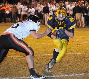 An injury hampered Gardiner in the regular season meeting between the two teams, which Mt. Blue won, 43-26. Connor was sidelined with an elbow injury in the first half, but the Tigers didn’t hesitate to go to him almost exclusively on their first drive Friday night. It worked for a time, but they were forced to try a field goal after Shawn Keach stopped Connor for a 3-yard loss on 3rd and 4. Chris Cautillo blocked Meehan’s 35-yard attempt to keep the game scoreless.