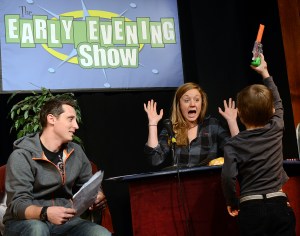 Then the gang gets carried away, literally. Miclon and Early Evening Show orchestra leader Oren Robinson are supposed to escort Casey Turner off the stage in the scene, but during one run-through Miclon breaks character, puts on a sleazy voice and pretends to abscond off stage with Turner.