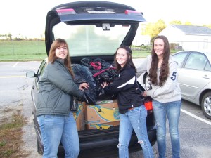 Members of the Lisbon High School Interact Club supported a fall community service project during September benefiting New Beginnings in Lewiston. Bill Denehy and Christine Wilson, members of the Lewiston-Auburn Rotary Club, invited Interact members to assist with gathering clothes for homeless teens as a back-to-school program. Thanks to assistance from Lisbon Area Christian Outreach and Lorraine Bard, guidance secretary, students stored donations during the month. Students meet every other week at 7 a.m. Interact students, from left, Samantha Foote, Ginny Tolbert and Sydney Tolbert load the donations for delivery.