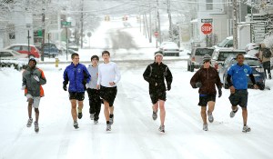 Runners from the Lewiston High School indoor track team make their way down Jefferson Street on a training run Friday. From left are Mohamed Mohamed, James Flynn, Andrew Balsamo, Kevin Lavertu, Michael Letendre, Jordan Balsamo and Abdifatah Mohamed.