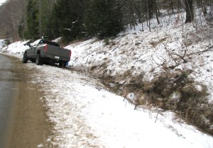 Evidence at the scene indicated that the truck veered off the outside edge of the curve onto snow and ice, entered a rock-strewn drainage ditch, and then rammed into a rocky embankment.