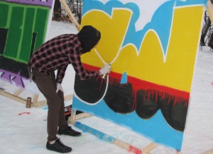 The event also featured three graffiti artists from Waterville who used different colors of spray paint to create the words Pray, Son and God just downslope from the Jib Park. Additionally, bands 13 High and Imune performed during the Rail Jam competition.