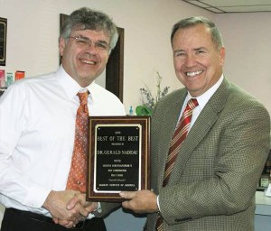 Market Surveys of America has named Dr. Gerald Nadeau, whose office is at 336 Center St., Auburn, as greater Lewiston-Auburn’s Best Chiropractor for 2011, an award also given in 2010 and once previously. In this 2010 photo, Nadeau, left, receives the award from Ed Morin of Market Surveys. Nadeau has practiced in Auburn for 27 years. He is a graduate of St. Dominic Regional High School and Palmer College of Chiropractic. He and his wife have four children. He has been involved and coached in the Lewiston area youth hockey league more than 25 years.