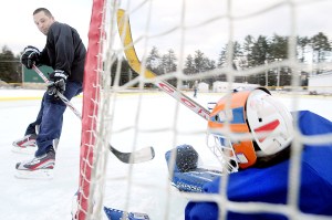 Dave Cloutier of Auburn shoots on goal as Scott Decker of Mechanic Falls covers the net at the ice rink behind the Mechanic Falls Town Office on Tuesday. Decker’s sons Dylan, 15, and Chance, 10, also played in the pickup game.